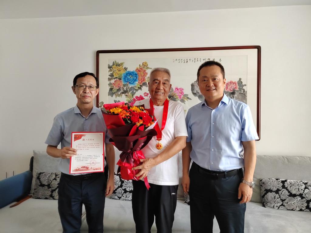 在庆祝中国共产党成立102周年前夕,校党委委员、副校长李学军在离退处党委班子成员陪同下,到我校“光荣在党50年”老党员家中看望问候老党员,为他们颁发“光荣在党50年”纪念章。为老党员送去党组织的亲切关怀,并向他们致以崇高敬意。