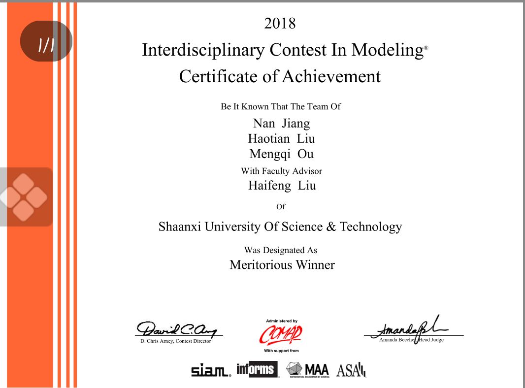 2018年美国大学生数学建模(MCM/ICM)竞赛成绩近日揭晓,我校文理学院刘海峰副教授指导,由姜楠(信息152)、刘昊天(信息151)、欧梦琪(英语152)三位同学组成的参赛队获得一等奖(Meritorious Winner),创历史最好成绩。本届比赛于2月9至13日举行,吸引了来自全球19个国家和地区,包括哈佛大学、哥伦比亚大学、清华大学、北京大学等著名学府的20602支代表队的6万多名学生参与角逐。