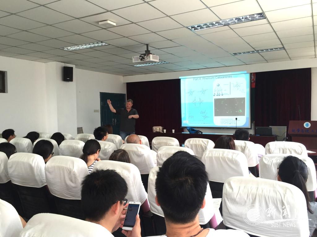 Carl Redshaw 教授做了题为“The coordination chemistry toolbox”的学术报告。讲解了他以配合物为研究对象,在可用于生物降解聚合物的新型催化剂、金属成像/抗癌剂、气体储存、水分解和传感器方面开展的研究工作及取得的研究成果。