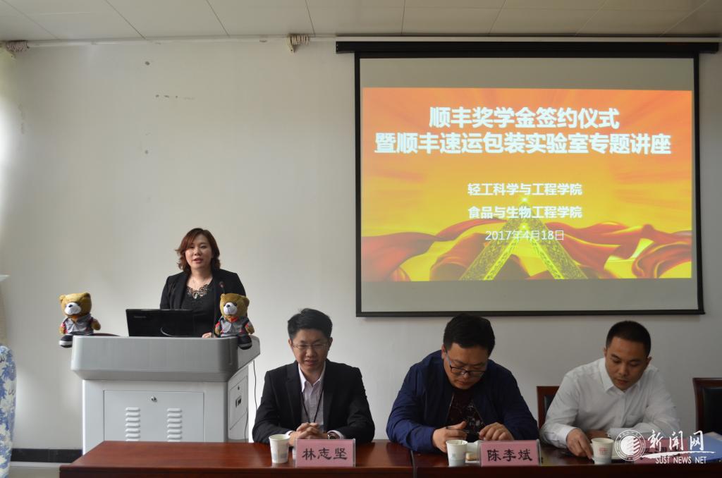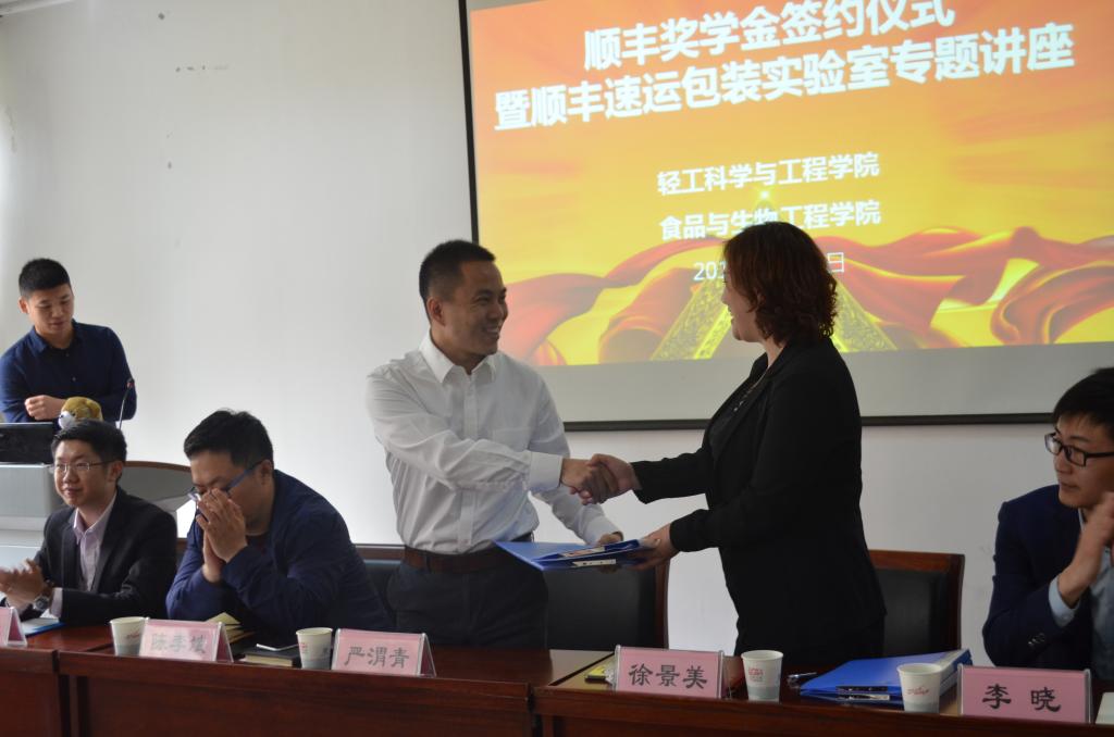 4月18日,顺丰企业奖学金在我校轻工科学与工程学院、食品与生物工程学院设立。两个学院联合举办了奖学金签约仪式,相关院领导、顺丰速运包装实验室负责人徐景美、顺丰速运人才管理处人才管理高级经理张燕、顺丰集团招聘组招聘高级经理李少强、林志坚出席仪式。