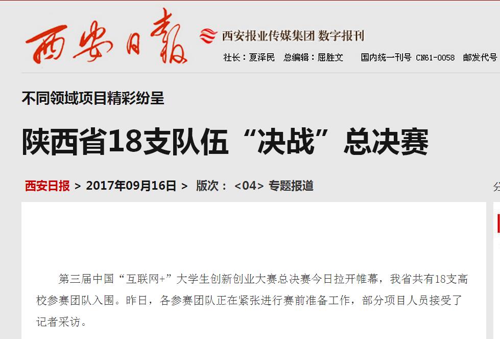 9月16至18日,第三届中国“互联网+”大学生创新创业大赛总决赛在西安电子科技大学举行,我校2支队伍入围总决赛。陕西广播电视台《新闻联播》、《西安日报》等媒体对我校参赛团队进行了报道。