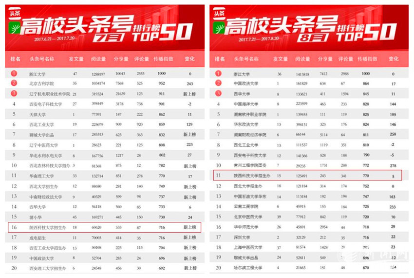 教育部与“今日头条”官方出具的榜单中,不论是头条号还是文章质量我校都位居前列。这是因为我校招生办头条号紧抓高考热点,精心设计编辑,在招生咨询、招生录取和迎新工作等各环节,总是及时发布最新的招考资讯及学校信息,使得考生和家长能够第一时间获取和了解。如《国务院首批88所重点大学,从北京辗转西安,轻工专业国内顶尖》、《千亿(中国)2017年在陕招生计划》、《西安高校豪华餐厅:咖啡、桌球、娃娃机、篮球机齐聚一堂》等十余篇文章阅读量、推荐量过万。单篇文章《科大新生:拿到录取通知书,为何迟迟不愿拆开?》阅读量超过7万,进入“高校头条号8月文章排行榜TOP10”。