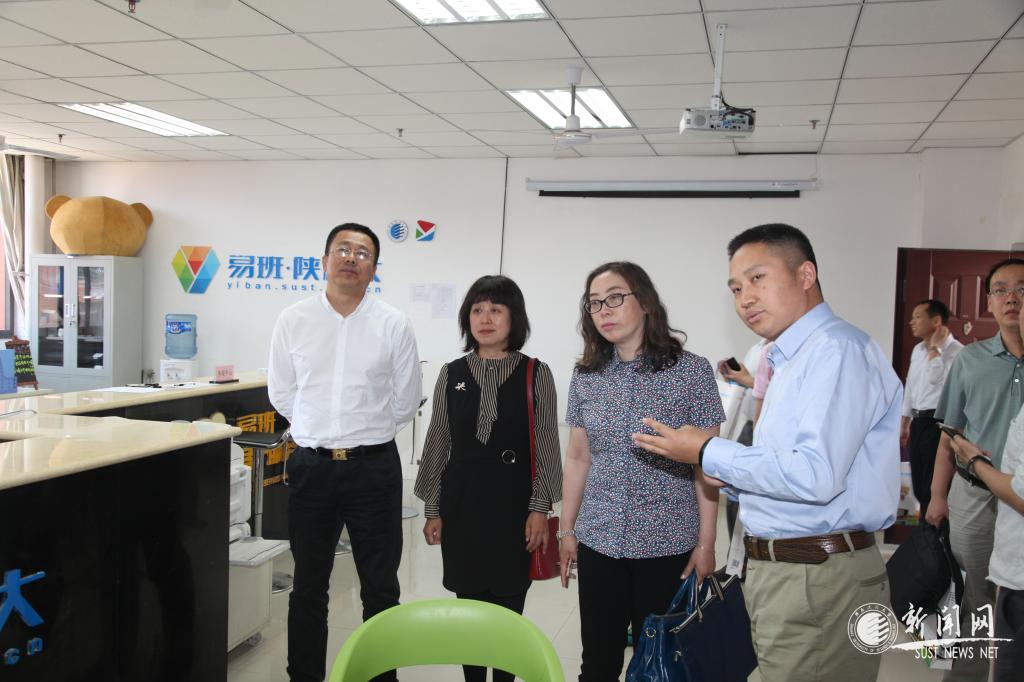 校党委副书记温锋(左一)陪同王莉(左三)等参观了我校易班学生工作站