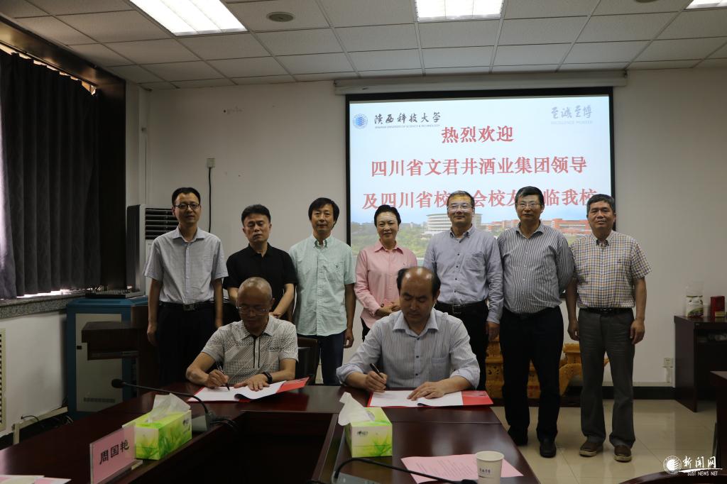 在学校60周年校庆即将来临之际,四川省文君井酒业集团有限公司董事长柳先华和总经理黄蜀生(自动化81级校友)及四川校友会秘书长张锦阳(造纸81级校友)一行来我校进行座谈交流,副校长李志健出席了座谈会,座谈会由前沿院常务副院长殷海荣主持。科技处、前沿院、校友总会、食品生物与工程学院相关负责人参加了座谈会。