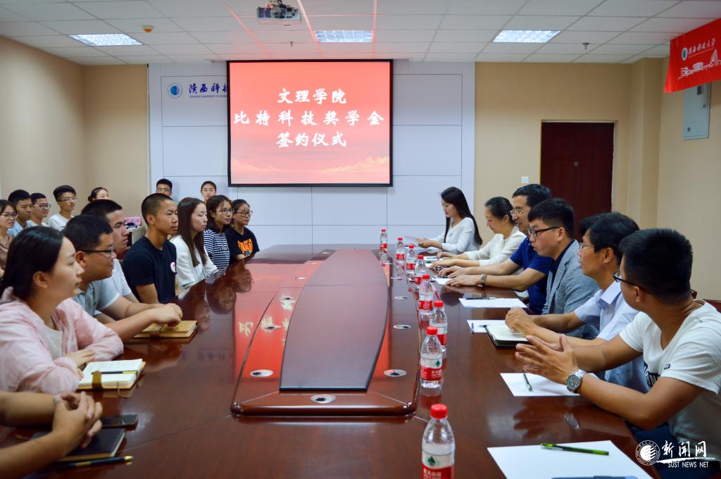 5月28日下午14时30分,“比特科技奖学金”签约仪式在理科楼444教室举行。西安比特教育科技有限公司总经理杨斌,文理学院院长蔺小林、副院长白云霄、院长助理彭丹、数学系主任侯再恩、数学系教师代表梁新亮、学院全体辅导员以及数学系学生代表出席仪式。