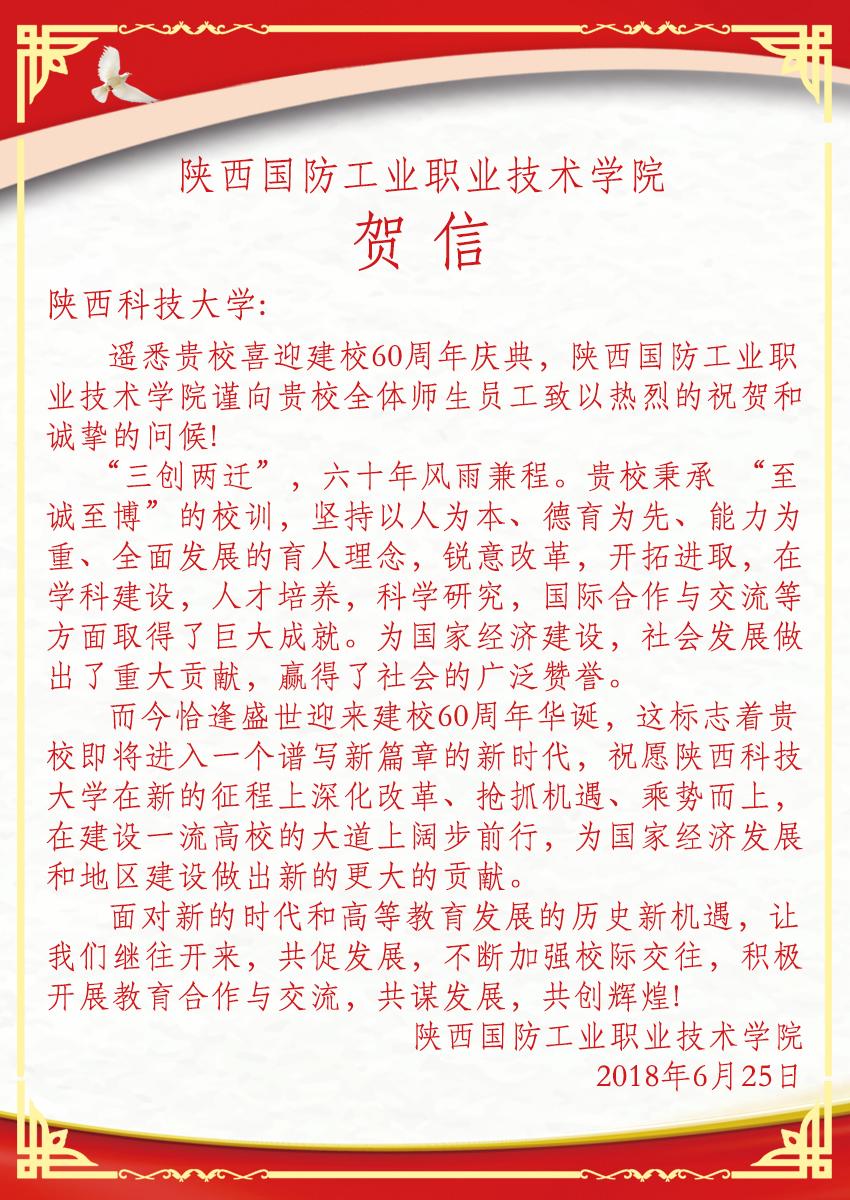 【甲子校庆】陕西国防工业职业技术学院贺信