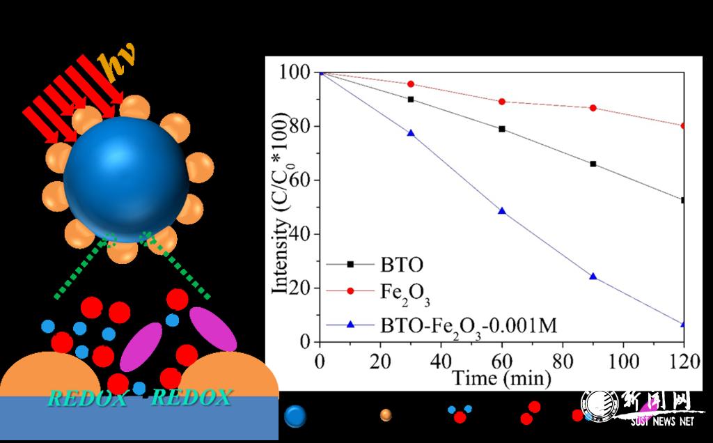 崔永飞副教授是材料学院2016年引进的高水平博士,在《ACSApplied Materials & Interfaces》(SCI一区,IF=8.097)上发表研究工作。该工作将铁电BaTiO3与赤铁矿α-Fe2O3异质结合形成复合光催化剂,通过调控α-Fe2O3的质量分数,所获得的最佳组分的异质复合光催化剂展现出比单一BaTiO3和α-Fe2O3均优良的光催化降解罗丹明B的性能,这主要归因于异质结构促进光生载流子的有效分离,同时铁电内建电场能够抑制光生载流子的复合;同时研究发现BaTiO3与α-Fe2O3的界面形态对光催化效率起着至关重要的作用,过多的α-Fe2O3负载量会阻碍BaTiO3基体的光子吸收,并且导致光催化活性位点的缺失。