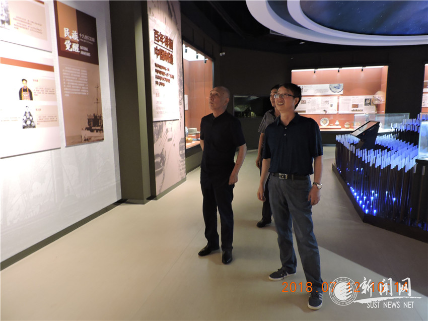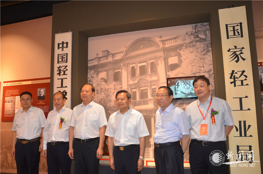 中国轻工业联合会会长张崇和(右三)、中国轻工业联合会党委副书记王世成(左三)、中共陕西省委高教工委书记董小龙(左二)、校党委书记姚书志(右二)、校长马建中(左一)等人在中国轻工业博物馆内合影