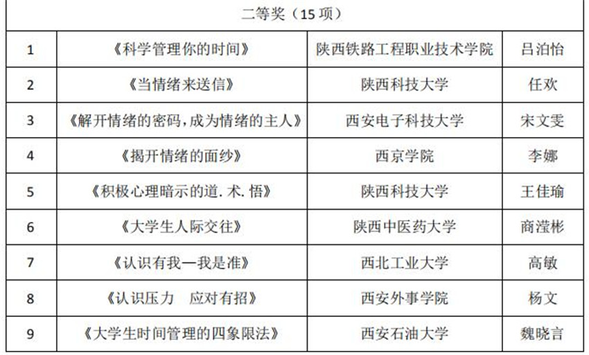 9月7日,陕西普通高校心理健康培训与研修基地公示了2018年陕西普通高校心理健康教育课优秀教案评选结果,我校推选的4件心理健康教育课程教案全部斩获佳绩,获得一等奖2项(全省10项)、二等奖2项(全省15项)。