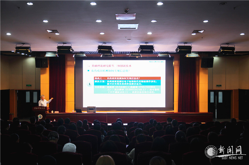 中国工程院院士庞国芳院士应邀于9月16日上午做客我校院士论坛,在教师发展中心学术报告厅做了题为“信息化引领食品安全农药残留检测技术创新发展”的专题报告。校长马建中、学科办和食品与生物工程学院有关负责人及师生代表500余人参加了本次报告会。报告会由副校长王学川主持。