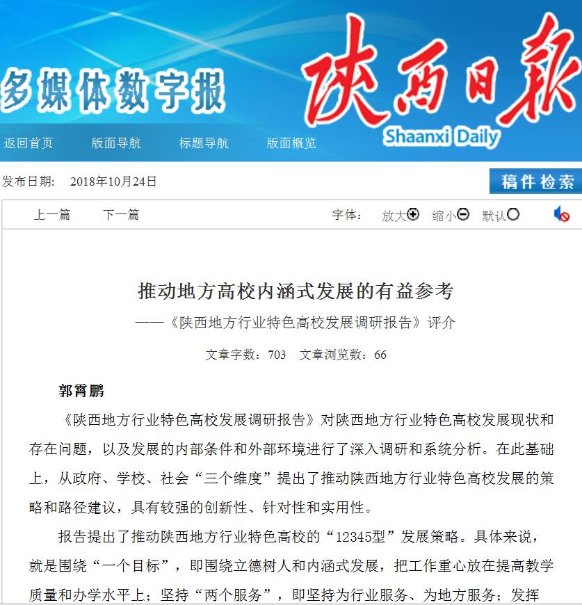 《陕西日报》2018年10月24日“理论专版”刊发我校郭霄鹏教授团队获奖成果评介,题为“推动地方高校内涵式发展的有益参考——《陕西地方行业特色高校发展调研报告》评介”。该成果获得陕西省第十三次哲学社会科学优秀成果奖一等奖。
