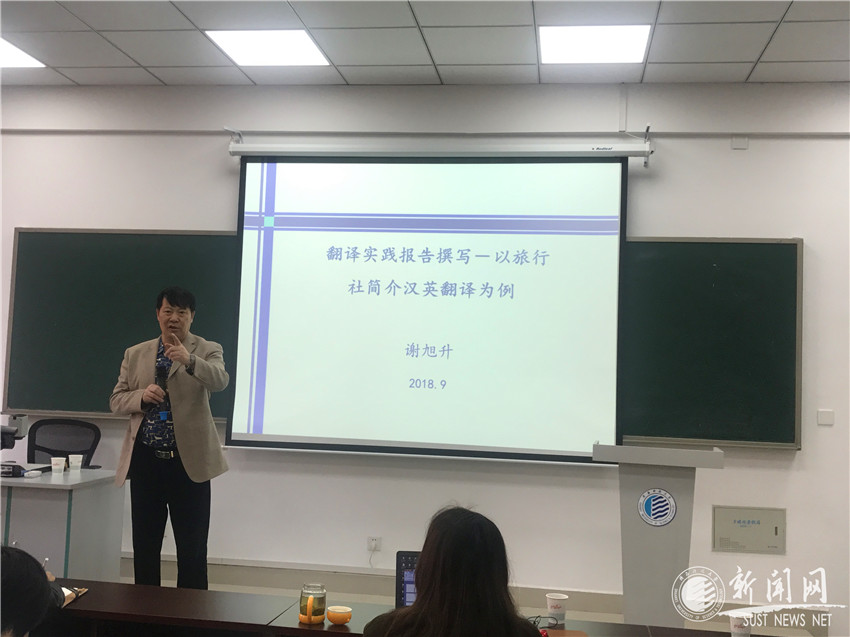 谢教授结合自己多年来的翻译实践,分别以“对外传播视角下的变译”、“公示语与翻译:语言转喻与文化传播”、“MTI研究生培养的问题与对策探讨”以及“翻译实践报告撰写-以旅行社简介汉英翻译为例”为主题进行四场学术讲座。讲座中,谢教授指出,翻译应该忠诚于原语意图,充分考虑到文化因素。由于汉语与英语的表达、文风等方面存在较大差异,译者应该针对不同文本类型、受众背景和语言功能,充分发挥译者的能动性,进行有效翻译。谢教授还从译前、译中、译后三个阶段,具体阐释了如何撰写翻译实践报告。