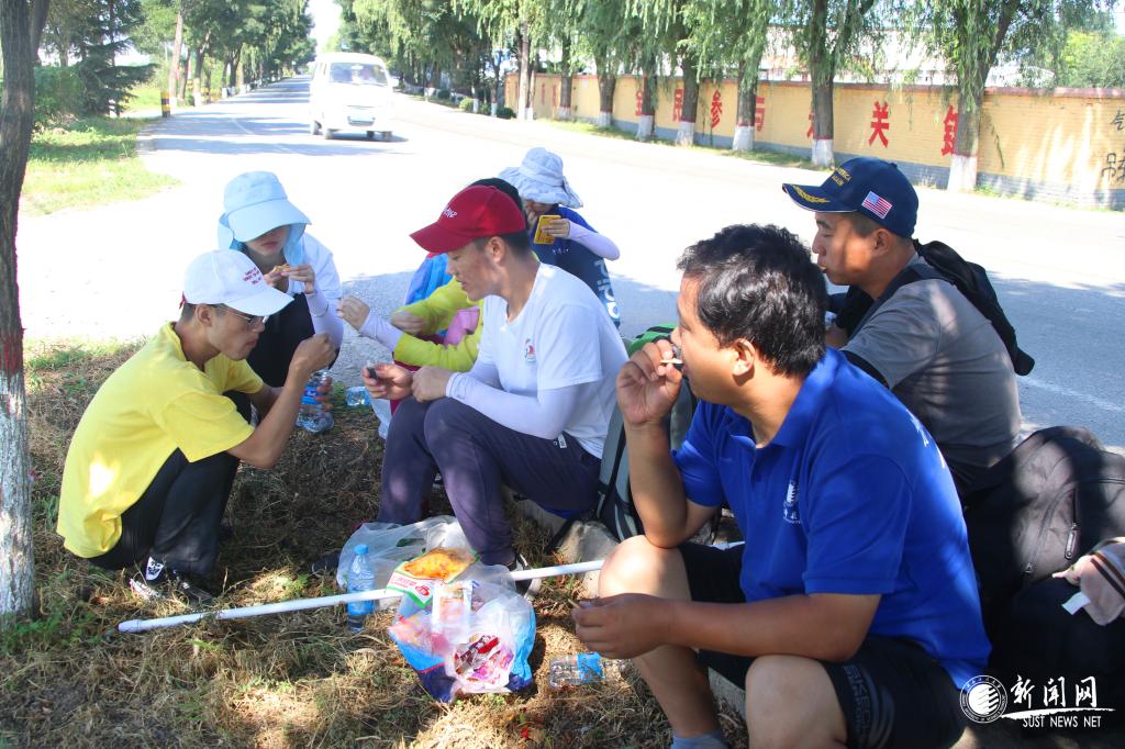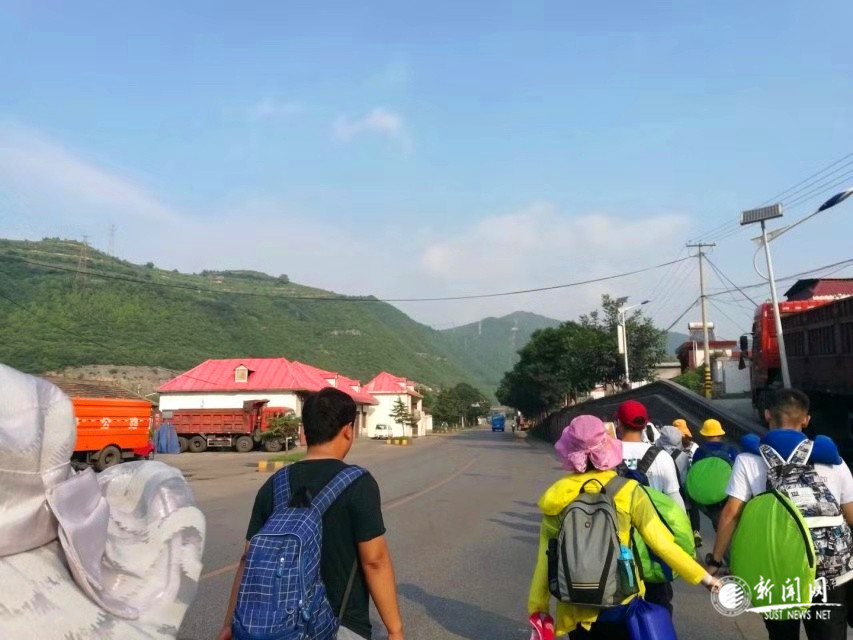 每位队员都也无法忘记,他们第一天便经历了严峻考验。2018年7月20日,西安市已进入最炎热的三伏天,体表温度高达43度。一行10人举着队旗扛起行囊向北迈进,热血方刚正少年,年轻的灵魂以崇高的理想做支柱,欢快的身影在树荫下穿梭。然而行走两个小时,队员们便陆续出现了脱水、中暑的现象。一望无际的关中大地上的八百里平川,孤零零的一棵草一棵树,骄阳将大地烫的炙热,在队员们眼中渐渐升腾成虚幻的景象。突然间,队伍后面的一个女生倒下了,她的脸涨的通红,没有力气的靠在墙边坐下来。跟在后面的老师迅速扶起这个女生,队员们也七手八脚迅速过来帮忙,拉开防潮垫,喂下藿香正气水,用滴了风油精的湿巾擦拭脸部,补水补盐补充糖分,拿着大扇子不停扇风......有的队员自己也已疲惫不堪,但他们还是围绕在病员旁边照顾。队伍里还有个男生崴了脚,周围又没有冰袋,他硬是咬牙坚持走到一个村子的小卖铺里用矿泉水冰镇脚踝减缓疼痛。汗水湿透了每个人的衣服,又迅速风干留下白色的晕记,干燥的风里蝉鸣声显得越发扰耳。暮色降临,空气的热度似乎降低了那么一点点,大家渐渐适应高强度的拉练,加快了行走速度,终于在晚上十一点钟驻扎在三原县渠岸镇初级中学。