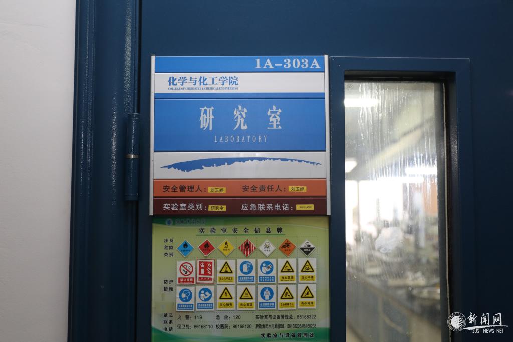 全校实验室的门上都张贴着一张“实验室安全信息牌”,上面分栏显示了“涉及危险类别”“防护措施”“紧急联系电话”,并填写了安全管理人、安全责任人姓名,这是学校实验室安全管理的细节。