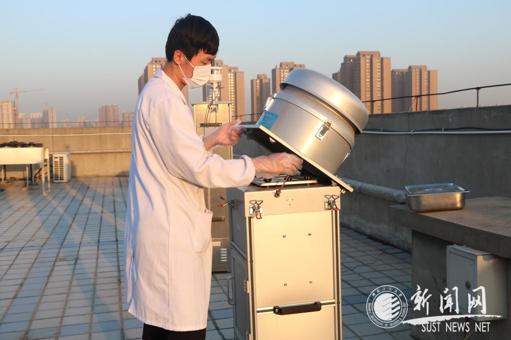 早晨6:30的实验室,当大多数人还在睡梦中时,环境学院陈庆彩老师指导的大气污染与控制研究团队已经开始认真的工作,迎着初升的朝阳,牟臻,华晓羽,陈前等研究生站在逸夫楼顶的实验仪器前,取样,收集,整理,记录,静静地忙着手头的工作。这项研究目前已经开展了将近三年时间,为了保证数据的连续性,这项工作一天都不能停止,即便是寒暑假、春节、大年初一的早晨,他们的工作也依然没有停歇过。
