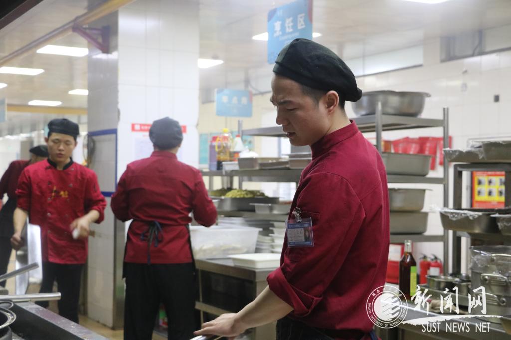 天还没有全亮,大多数学生沉浸在梦乡,餐厅却早已灯火通明。为了让学生们吃上热气腾腾的饭菜、拥有良好的用餐环境,六点多的后厨已是一片忙碌,食堂的工作人员正精心的准备着一天的早餐。工作人员告诉做餐饮最重要的就是保持原材料的新鲜和口感,不断的更新菜品,让学生们吃到满意的饭菜。虽然日复一日的重复性工作会有些繁琐,但他们每天都做的无比认真。炊事员刘洋虽然年轻,却已经在沁园餐厅工作了两年,他一边忙着炸制早餐用的食物,一边笑着说“不累,我们早已经习惯了”,这声简简单单的“习惯了”,背后却是汗流浃背的坚持,是高温为了保证学生吃的健康的责任感。刘洋是外地人,他一学期才能回家一次。尽管长期不能与家人见面,只能与家人视频通话,但这并不影响他的工作状态。每次做菜的时候,他都会想这是为自己的亲人做的一餐,一定要做好。