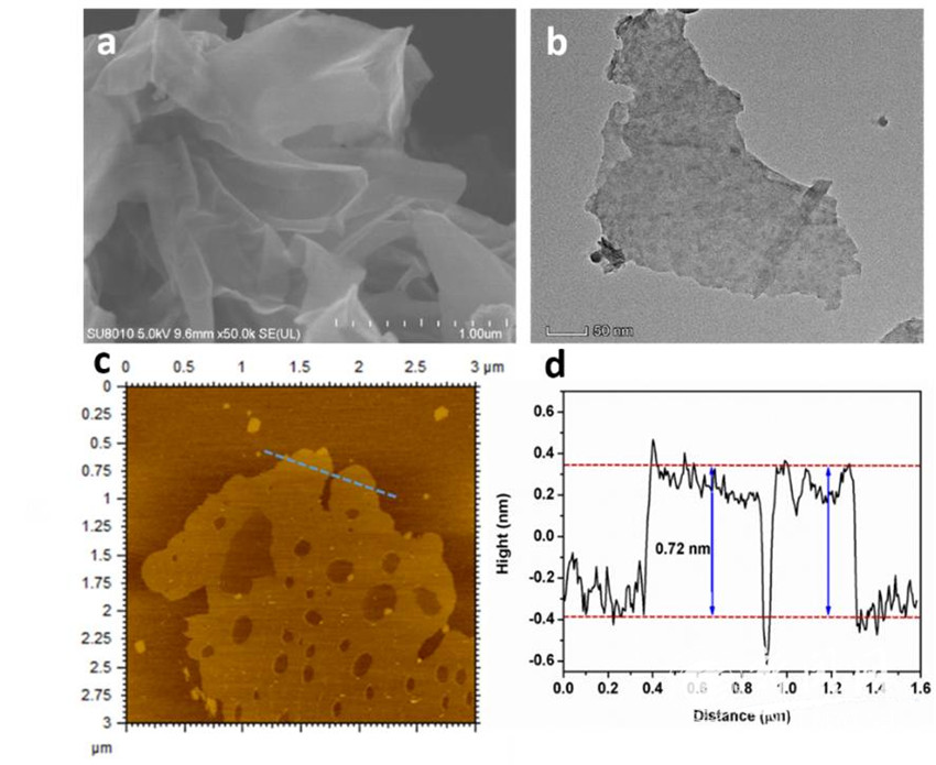 Co0.85Se样品的SEM(a), TEM(b), AFM(c,d)图