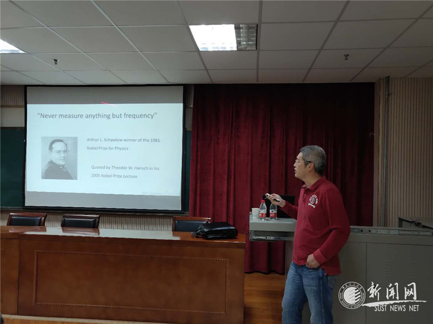 姜海峰教授首先从经典物理学牛顿时间概念出发,以时间频率技术的基础性、广泛性和前沿性基础,通过对飞秒光频梳研究领域诺贝尔物理学奖的梳理,对飞秒光频梳技术的特点、分类以及研究现状等进行了详细报告。他还以课题组近十年在飞秒激光光频梳领域的取得的研究成果为主线,进一步报告了飞秒光频梳的发展趋势及其他们课题组在该领域的研究贡献。姜海峰研究员的报告既有物理基础,又有理论背景和学科前沿成果报告,使在座听众对飞秒光频梳技术的重要性有了新认识,并产生了浓厚的兴趣。