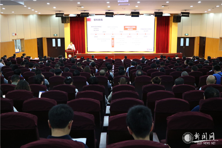 大学排名是大学综合实力和竞争力的集中体现,其提供的信息对我校了解自身的表现,特别是明晰与“追赶超越”目标的优势与差距,具有重要的参考价值。为贯彻学校第二次党代会精神,进一步落实《千亿(中国)“复兴计划(“奠基期”2018-2022年)》提出的目标任务,5月30日,我校邀请上海软科教育信息咨询有限公司咨询项目主管杨其祥博士一行来校做专题报告《大学与学科竞争力分析与实施策略》。报告会前,校长马建中、副校长李志健与来校专家进行了座谈。全体在校校领导,正科级以上干部(含正科),正高级职称人员,学院学术委员会委员、教学指导委员会委员、系主任(教研室主任、实验室主任)等500余人参加报告会,报告会由发展规划处处长、高教研究室主任杜致博主持。