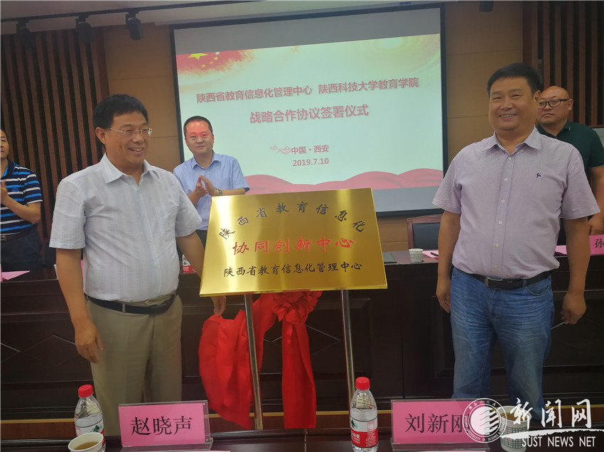 朱选文、刘正安分别代表陕西省教育信息化管理中心、教育学院致辞并在合作协议上签字,同时为信息中心在我校设立的陕西省教育信息化协同创新中心揭牌。双方一致表态,将发挥各自所长,优势互补,在人才互聘、专业共建、产学研合作等方面开展全方位合作,将合作框架的蓝图落到实处,做出成效,携手共同服务、支撑陕西省信息化教育,加快教育信息化人才的培养。