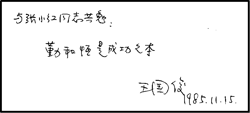 和年轻学子一样,我年轻时也会追星,我崇拜的明星很少,不过却坚持了几十年。这里,也分享给大家一位我崇拜的明星。读大学时,我校多次邀请当时担任陕西师范大学校长的王国俊教授来作学术报告,他曾经在我的家乡做过中学老师,不仅数学研究很深入、成果丰富,课也讲得很漂亮,我被他的魅力深深吸引,听他讲数学就是一种享受。毕业留校那年,我校再次邀请王国俊教授来作报告,我很荣幸参与接待他。在学术交流间隙,我带着刚拿到不久的首个教师节纪念册,找他签名,并希望他给予指点。王老师把他的座右铭写了下来赠予我,这也成为我日后几十年激励自己不懈努力的座右铭。
