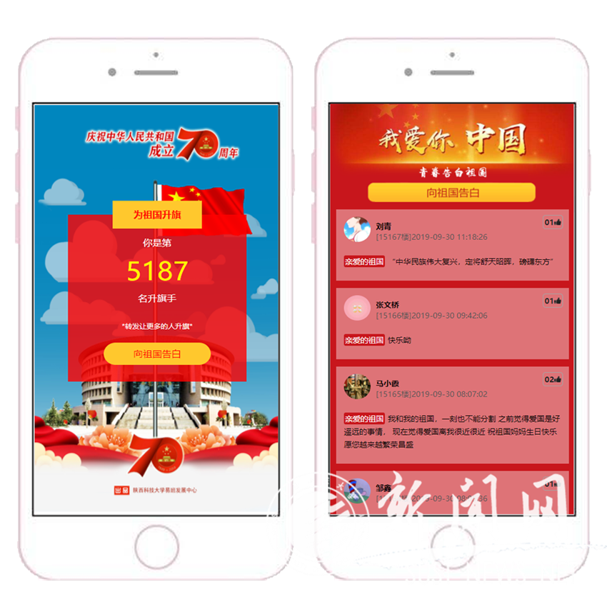 校易班发展中心最先在网上发起“我为祖国升国旗”H5页面,活动一经发起就得到广大青年学生的积极响应,活动上线仅1小时,学生通过易班、微信、QQ等平台完成的转发就达到1000余条,截止目前参加活动的人数已超过6000人。同时,校易班中心在易班网搭建“青春告白祖国”的轻应用,累计浏览量已超过10万次,通过网络发布的“告白”超过16000余条。