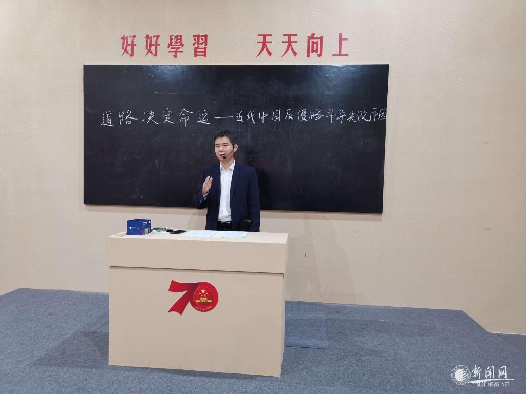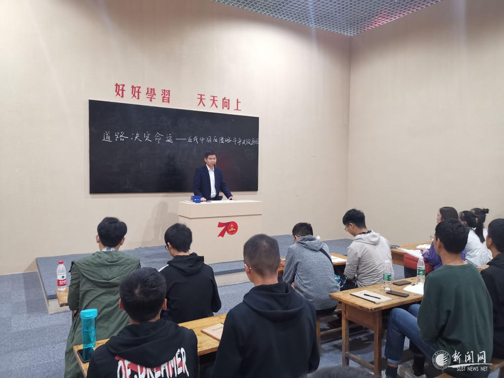 大粉笔、油漆的黑板、普通的小木桌、长条凳,10月10日下午,在陕西省庆祝中华人民共和国成立70周年成就展上,来自我校马克思主义学院的武端利副教授为40名大学生和部分参观群众上了一堂以《道路决定命运——近代中国反侵略斗争失败的原因》的现场思政课。