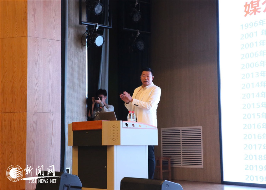 讲座开始,曾静平提出“如何看待网络语言?如何看待网红变化?”等热点问题,引发同学们关于“G时代新媒体”的主动思考。随后,他从时代变迁、媒介融合、新媒介、新思想、新产业、新素养几个方面讲述了近年来新媒体的飞速发展。他深入浅出地向大家阐述“G时代”下媒介传播形态所发生的翻天覆地的变化,指出媒体融合与我们的生活息息相关。