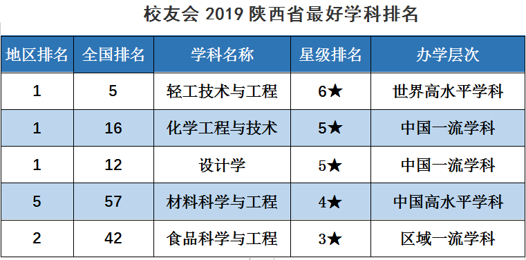 其中,轻工技术与工程学科全省排名第一,星级排名6星,层次为“世界高水平学科”;化学工程与技术学科全省排名第一,星级排名5星,层次为 “中国一流学科”;设计学学科全省排名第一,星级排名5星,层次为“中国一流学科”;材料科学与工程学科全省排名第五,星级排名4星,层次为“中国高水平学科”;食品科学与工程学科全省排名第二,星级排名3星,层次为“区域一流学科”。