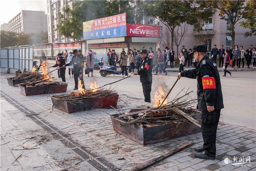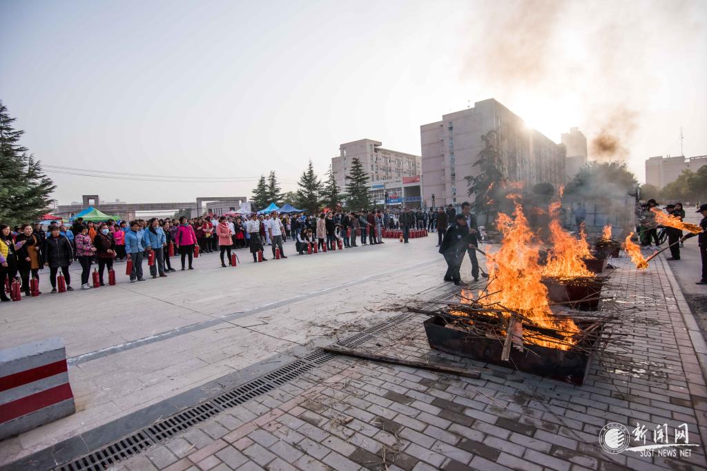 后勤人员进行演练,将灭火器对准火堆,拉下保险。