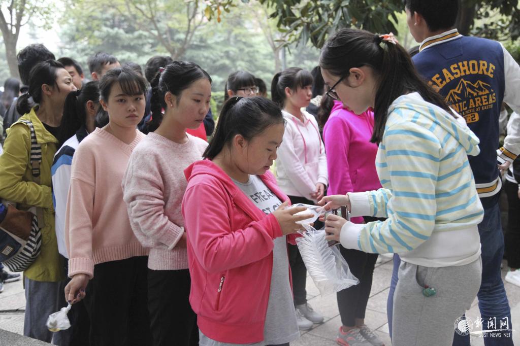 分镜头1:在测试场地门口,大三年级某班长正在给同学们分发测试肺活量的吹嘴。提到体能测试活动,他说,“大三年级的同学普遍比较重视这次体能测试,提前几天就在操场进行练习,当天早上一大清早就换好运动装,排队来到测试地点,以便能够取得好成绩。”