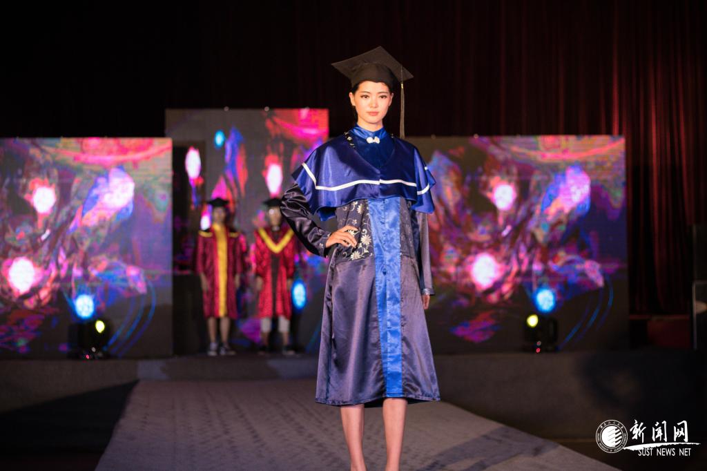 当晚,文体馆内热闹非凡,大气的LED屏,炫目的灯光,时尚的T台,模特与设计们为到场的观众送上了一场视觉盛宴。作品展演由三个篇章组成,经典学位服的创意方案展示;中式学位礼装的融合与演绎;箱包与鞋靴的创意方案展演。模特走秀总计展示作品总计48个系列,240套成衣、30套鞋帽及箱包。炫目的灯光下,伴随着节奏感十足的音乐,模特们充分展示了设计师对新时代学位服的理解和创意。当晚的走秀和点评持续了2个小时,服设毕业生们用实实在在的原创设计方案为盛夏的科大校园刮起了一股“时尚旋风”。