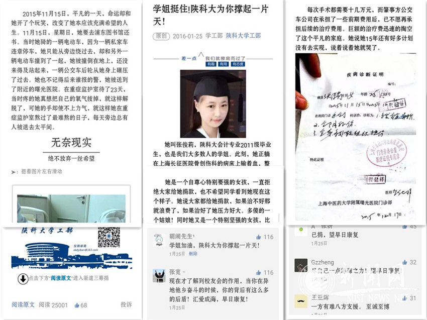 2015年11月15日,刚刚毕业不到半年的她在去往浦东图书馆还书的道路上发生车祸,经过十余次手术,欠下了近60万的医疗费用,也给这个贫寒的家庭带来了沉重的负担。今年1月20日起,微博上一则#Lily想活下去#的话题引起的大家的关注,这是张俊莉本人在微博上公开向公众求助。我校学工部也关注到了这条信息,通过联系当事人,确认真实性后,经申请批准,在我校易班和学工部官方微信平台在1月25日发布了题为《学姐挺住!陕科大为你撑起一片天!》的文章,号召全体师生及校友为这个年轻的女孩募捐。短短24小时,文章阅读量达22000人次,各方累计捐款达32万元。在社会各界爱心人士的帮助下,在母校的持续关怀下,坚强的张俊莉勇敢面对人生的挫折,于今年9月份回到上海平安普惠上班,重新制定了自身的职业生涯规划。