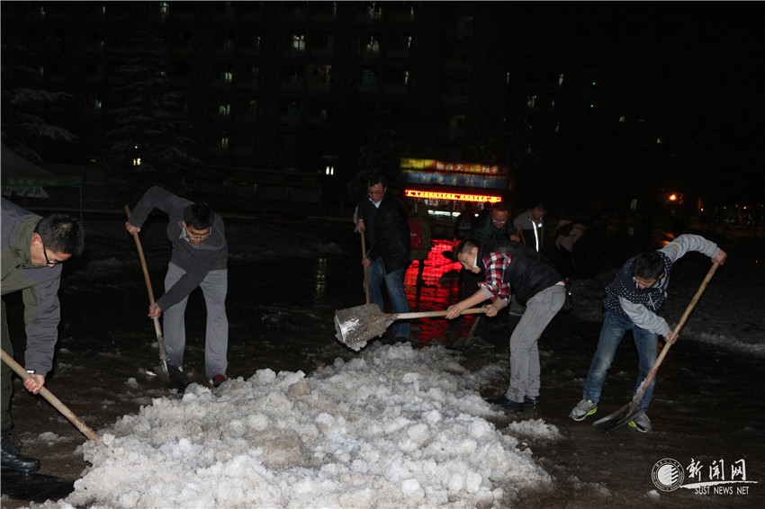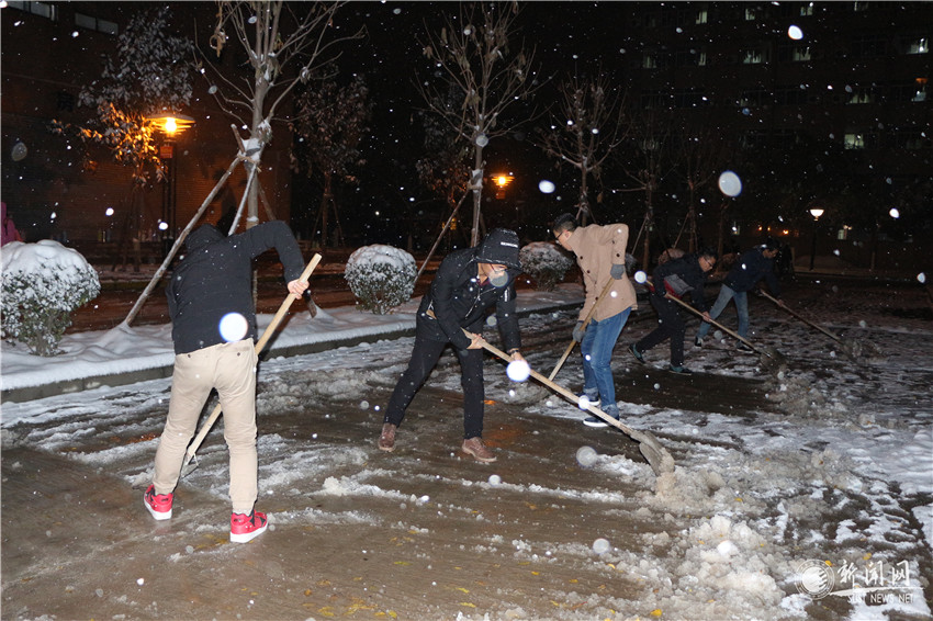 当晚,号召一经发出,学校阳光助学中心、国旗护卫队、公寓自管会、易班工作站纷纷响应,建立起爱心队伍组织铲雪行动,党委副书记温锋也亲临现场参与铲雪。冬日的雪夜寒风刺骨,志愿者们的手都冻得通红,但他们依然精神抖擞,不言辛苦,冒着严寒继续铲雪。他们的奉献之心感染了路过的学生们,纷纷加入到了扫雪除冰的队伍中。从党员到群众,从教师到学生,所有人的爱心汇聚成炽热跳跃的火焰,点亮,温暖了科大寒冷的夜。师生们齐心协力让这个雪天不再“湿滑”,切实保障了师生们的出行,保障了学校各项教学科研工作的正常进行。他们的热心构成了这个雪天校园中最美的风景。