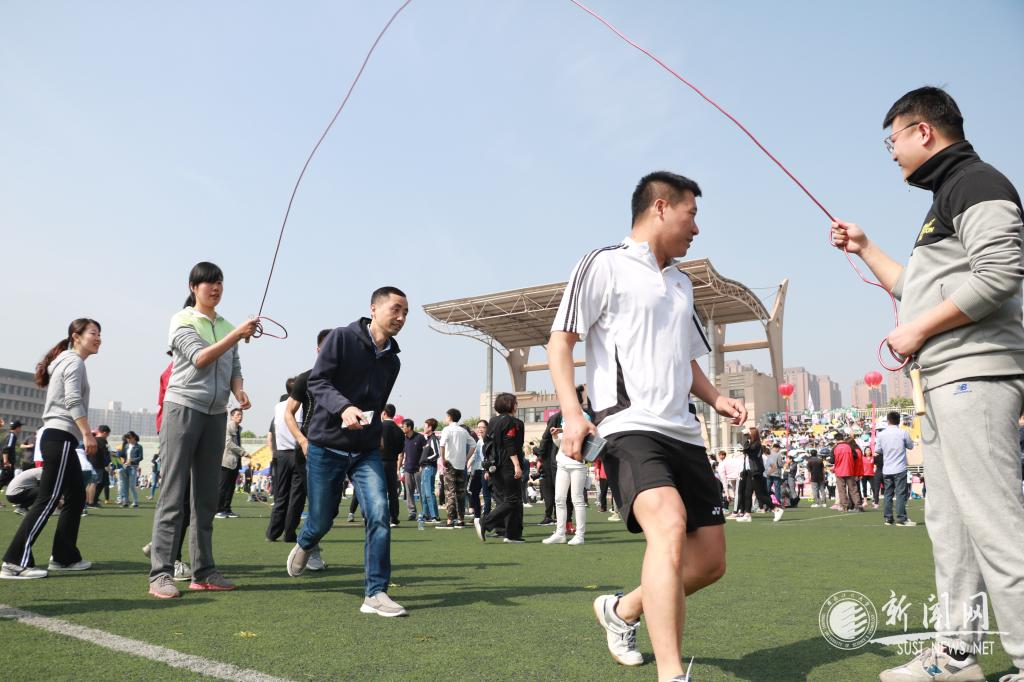 教工团体趣味比赛现场,三人踏板、跳大绳等比赛项目让人心悬紧绷,平时讲台上认真授课的老师们一改讲台上的端庄严谨,欢笑着投入比赛,尽情享受运动带来的快乐。