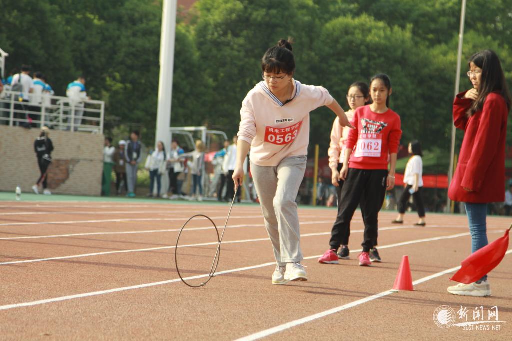 8:40,大学生滚铁环比赛现场生趣盎然,绿茵草地上的运动员们,左手拿圈,右手拿钩,调皮的铁环在他们自如的操控下顺利前行。男子组文理学院王建辉,女子组电信学院史月婷分别获得了男女组冠军。