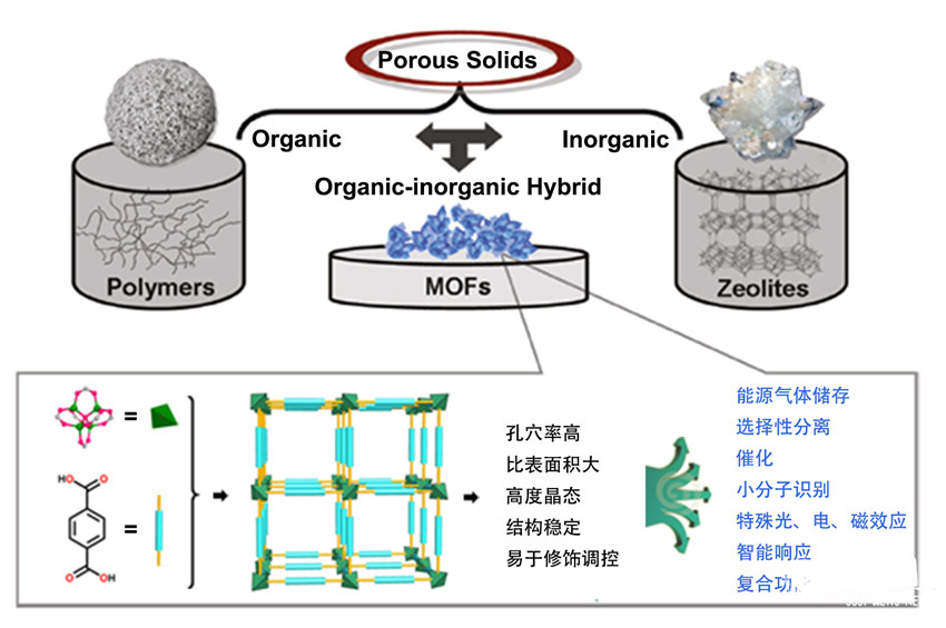 图1 金属-有机框架(MOFs)结构示意图及其特点与功能应用