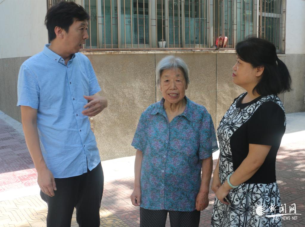 图为吴颖杰(左)与退休职工高秀珍(中)交谈